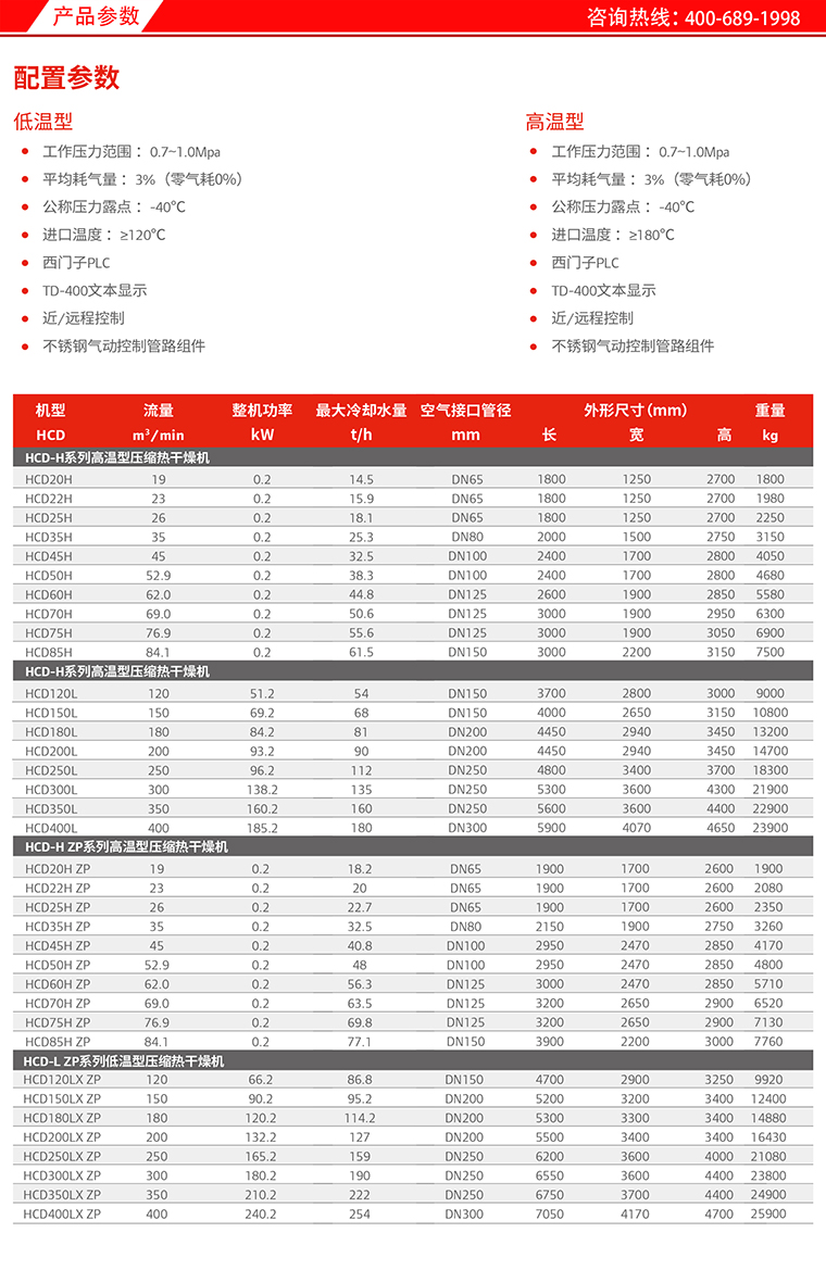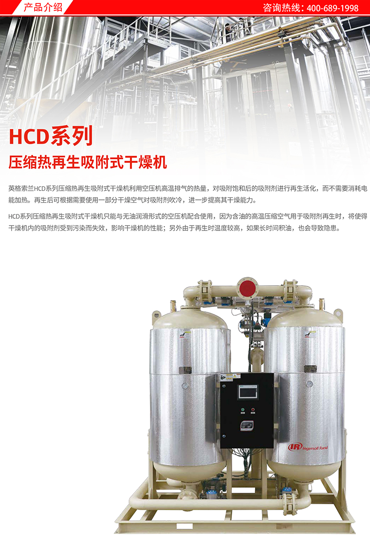 英格索兰压缩热再生吸附式干燥机HCD系列 流量:19-400m³/min 功率:0.2-240.2KW 服务热线:400-689-1998
