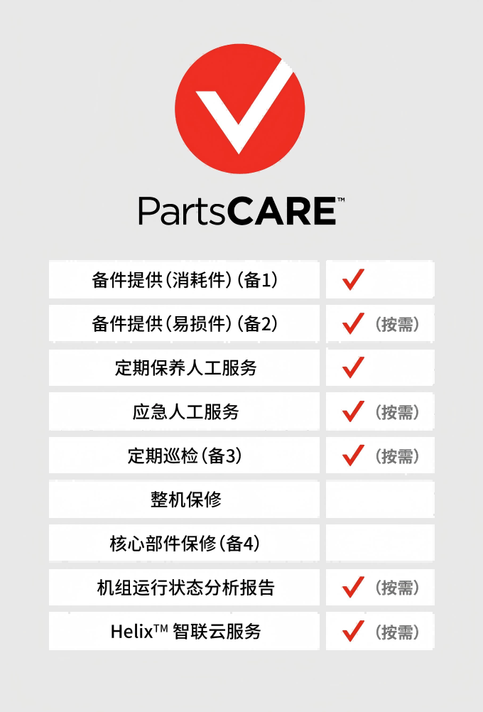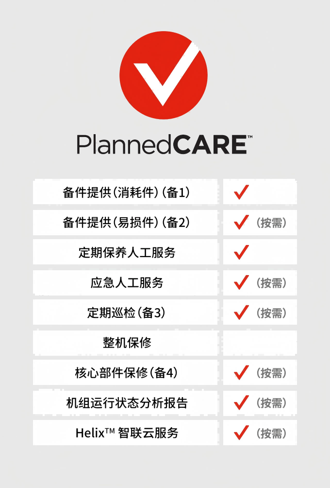 CARE服务计划根据不同的保养需求定制维护计划,提供更具成本效益的解决方案。根据您的压缩机系统维护要求,我们提供如下多样选择: