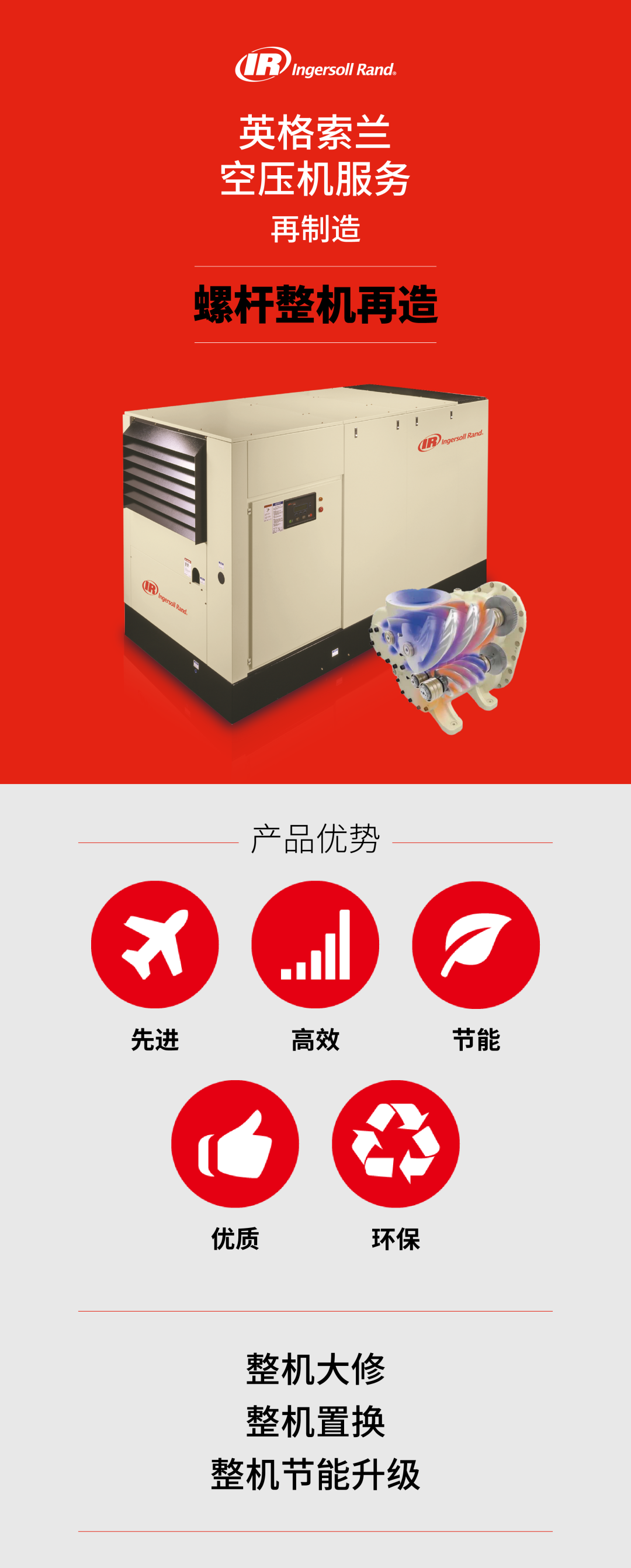 空压机产品在长期使用过程中不可避免地产生耗损,即使再坚固耐久,其性能也会打折。设备的耗损直接关系着企业的收益,为保障您的利益更少地受到影响,英格索兰推出再制造服务产品,通过经济且环保的方式,为您定制可持续的设备方案。